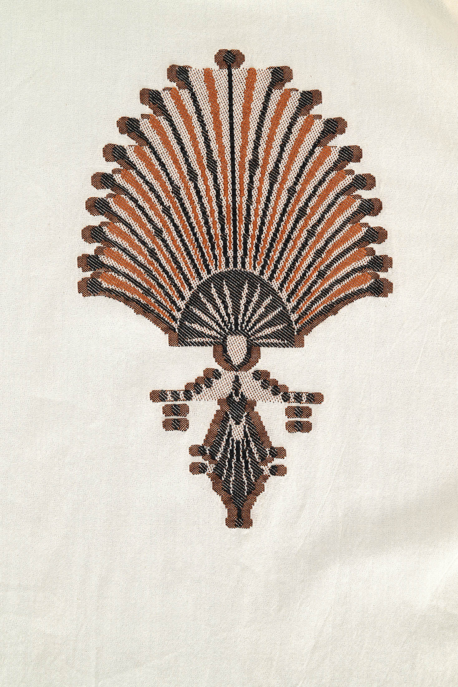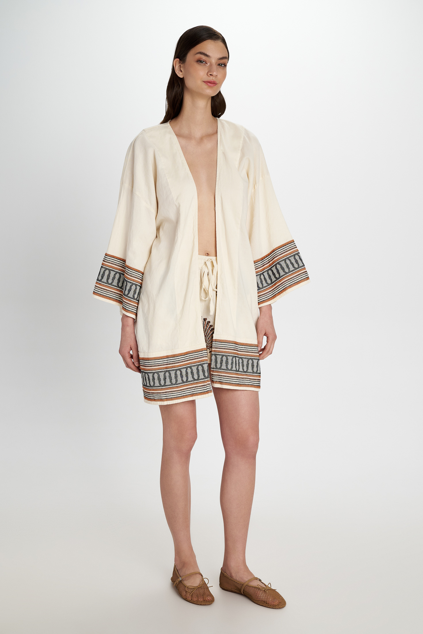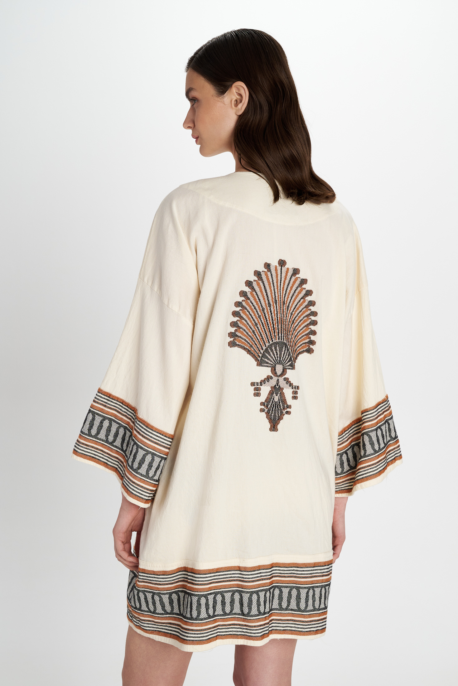 Elegant cream-colored base with decorative ethnic borders in black and warm terracotta on the sleeves and hem. The loose-fitting kimono has an open front and wide ¾ sleeves. An intricately embroidered ornamental appliqué on the back is a special eye-catcher.