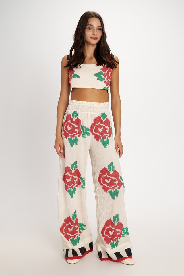 Cream-colored base with artfully woven floral rose motifs in red and green. The wide-cut trousers have a comfortable elasticated waistband for a perfect fit. A graphic finish in black and red at the hem creates a modern contrast.