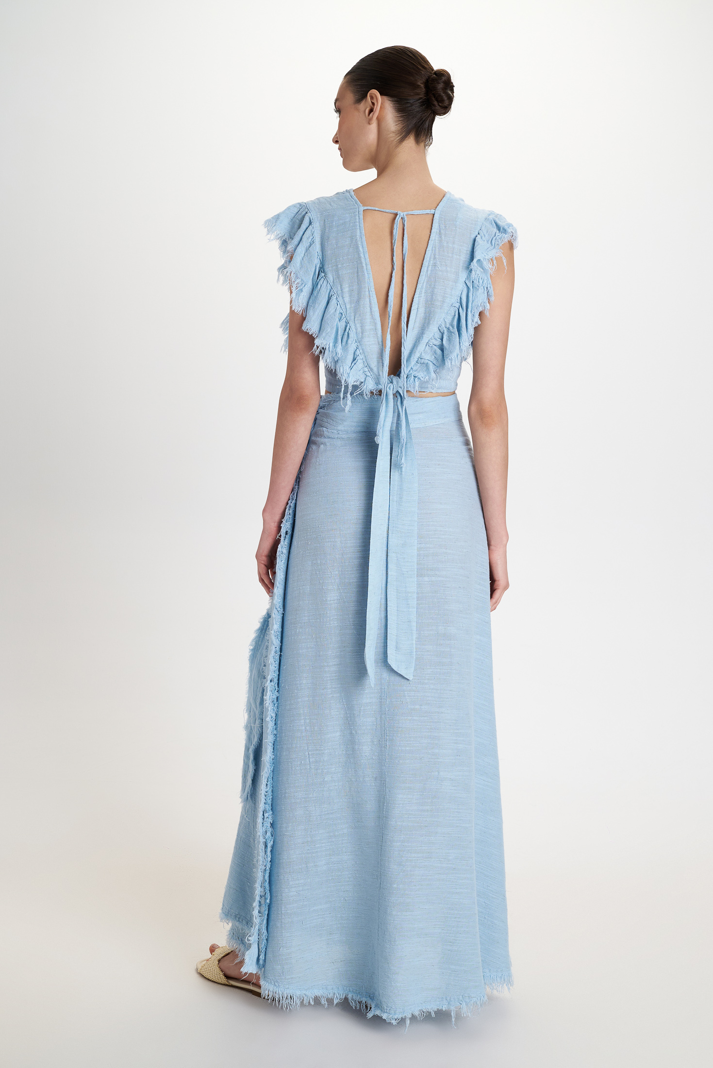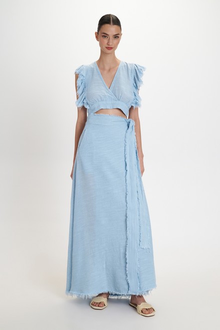 Delicate light blue shade with a natural texture. The long wrap skirt fastens at the side with a tie ribbon for a customizable fit. Fringed hem details and the soft, flowing drape give the skirt a modern, casual resort aesthetic.