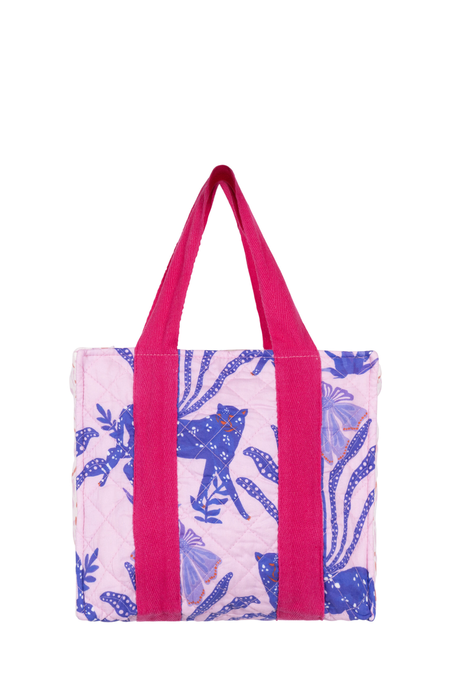 Color & details: Delicate rosé tone with an eye-catching blue tiger print in bold blue. The contrasting carrying handles in bright pink create a modern, fresh highlight. The quilted look gives the bag structure and a high-quality look.