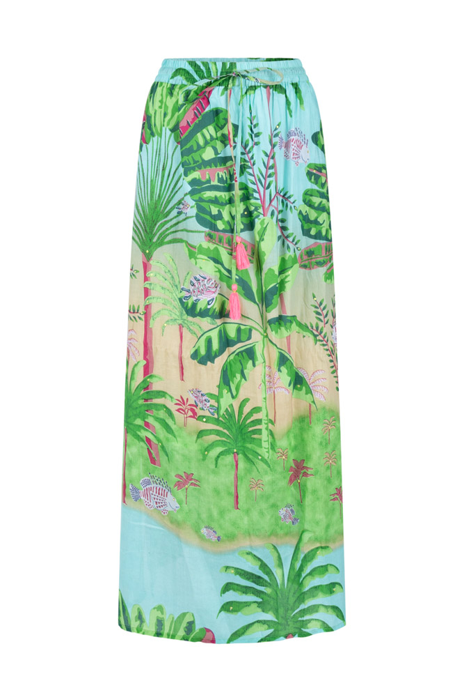 Maxi skirt by Place du Soleil made of lightweight cotton with a colorful jungle print, elastic waistband and tassel band – perfect for summer, vacations and beach looks.