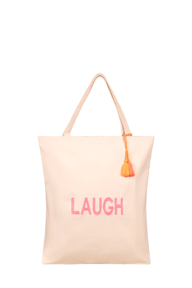 - Color & details: Single-colored tote bag in a soft cream tone with contrasting “LAUGH” lettering in pink. Decorative tassel in orange as a playful detail. Long handles for comfortable carrying over the shoulder.