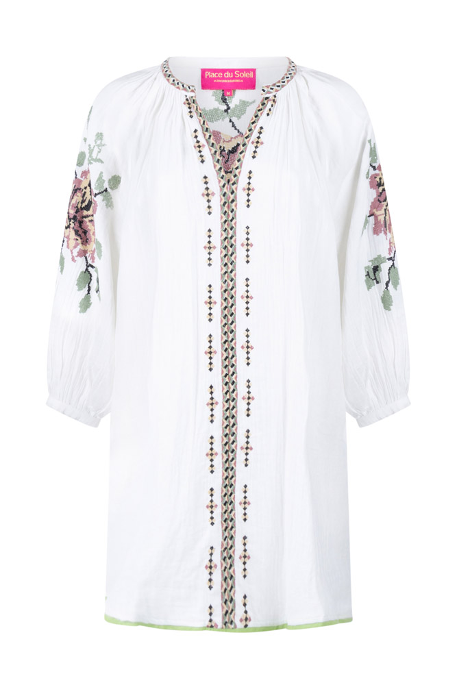 - Color & details: White tunic with intricate embroidery along the front in harmonious shades of green, rose and natural. Floral embroidery on the sleeves adds a feminine accent. Loose V-neckline with decorative border. 3/4-length sleeves with slightly gathered cuffs create a relaxed silhouette.