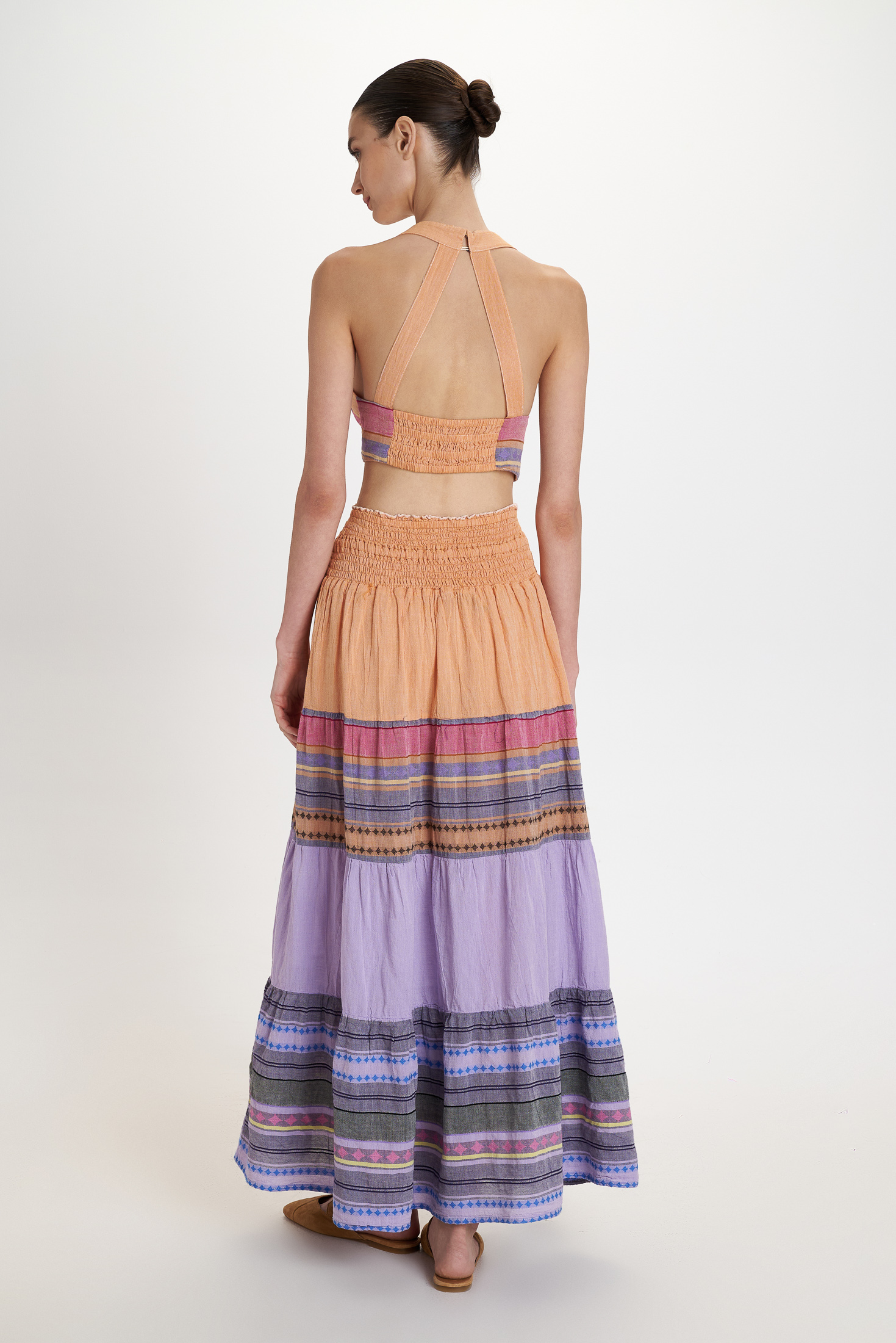 Multicolored striped design in lilac, pink, blue and warm sand tones with fine ethnic pattern elements. The cropped top has a feminine gathered bustier and wide halterneck straps that tie at the nape of the neck to create a beautiful silhouette.