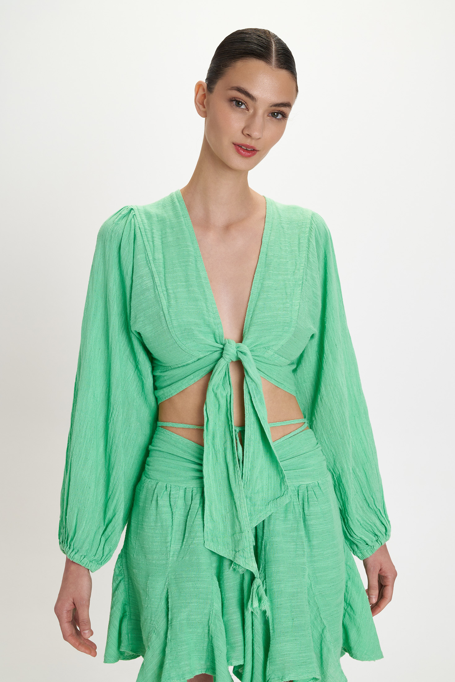 Fresh mint green shade with a natural texture. Feminine deep V-neckline with a decorative tie knot at the front, giving the top a modern, summery silhouette. The long, slightly voluminous sleeves with elasticated cuffs create an elegant, airy shape.