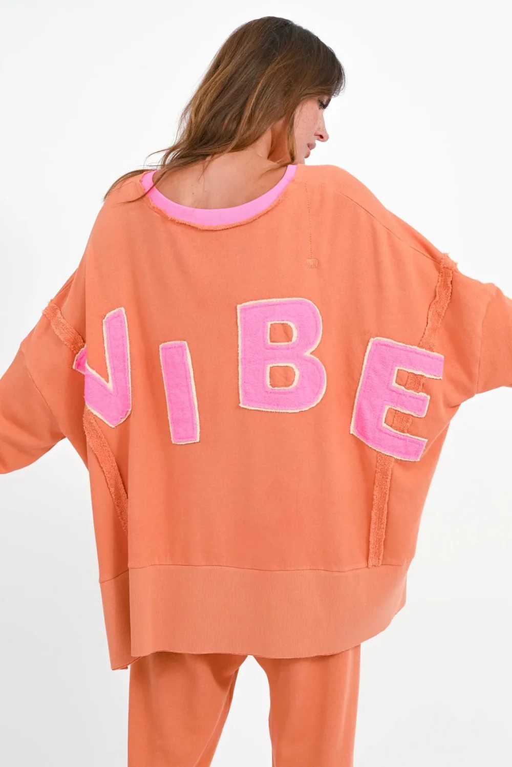 Color & details: Bright orange with eye-catching pink “VIBE” patches on the back. The contrasting round neckline, open seams and wide ribbed cuffs and hem underline the modern look. Side slits provide additional casualness. A small elephant embroidery on the right back adds a subtle signature detail.