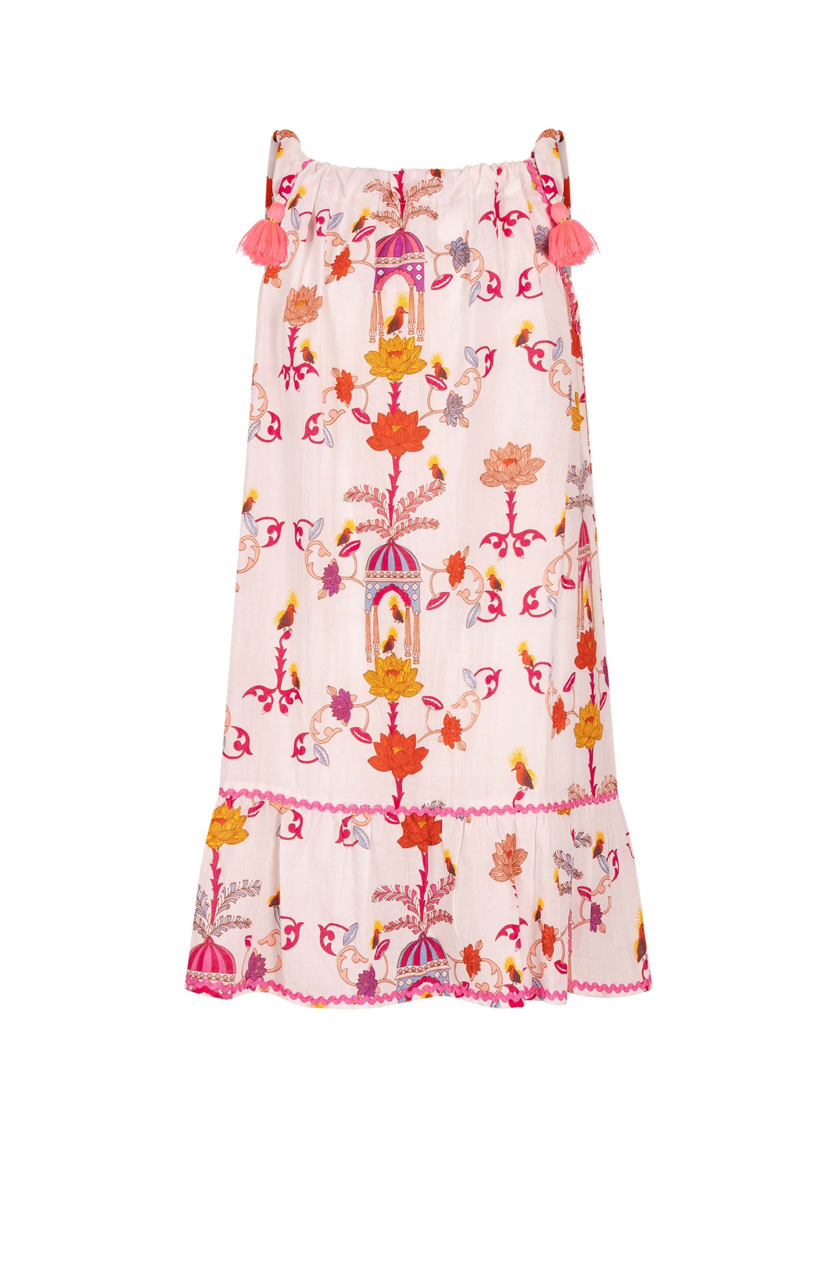 • Color & details: Delicate cream shade with an ornate, detailed print of floral elements, ornaments and exotic motifs in warm orange, pink and yellow tones. The narrow straps are decorated with playful tassels. Delicate decorative trims in pink along the tiers and at the hem lovingly round off the look.